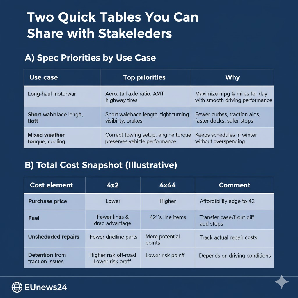 - Opex delta: 4×2 typically saves on fuel and parts; log it as cents per mile.