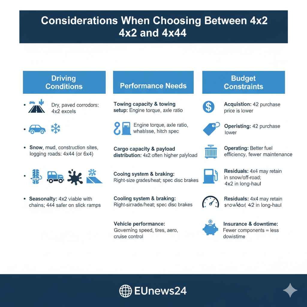 Track maintenance expenses and repair costs in your TCO. Many fleets find 4x2s deliver the best ROI on paved corridors with predictable weather.