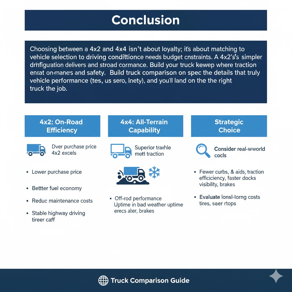 - Uptime delta: 4×4 reduces “stuck” events off-pavement; 4×2 reduces shop time on driveline components.